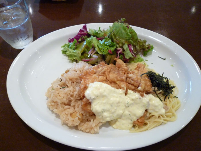 山菜ごはんにタルタルソースがかかって何とも微妙な味だったよ!