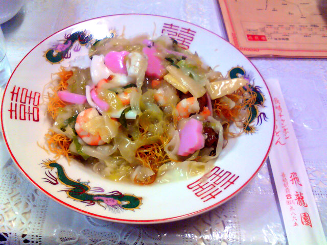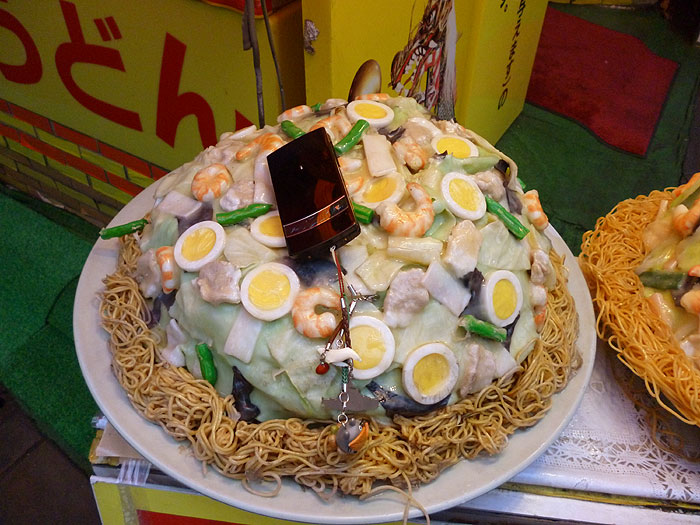 前日におごってもらった皿うどん店前のサンプル。my携帯との大きさ比較をぜひwww